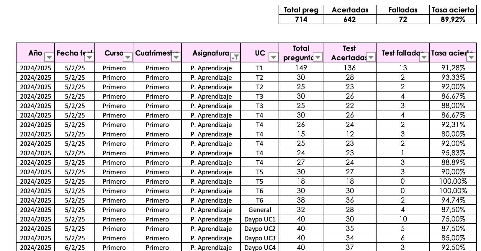 De todo esto, llevo un control en una hoja de excel, en la misma anoto las preguntas que respondo y las tasas de acierto y fallo. Si a un examen voy con una tasa de acierto del 95%, voy a ir mas segura y con más confianza, que si llevo una tasa del 20%.